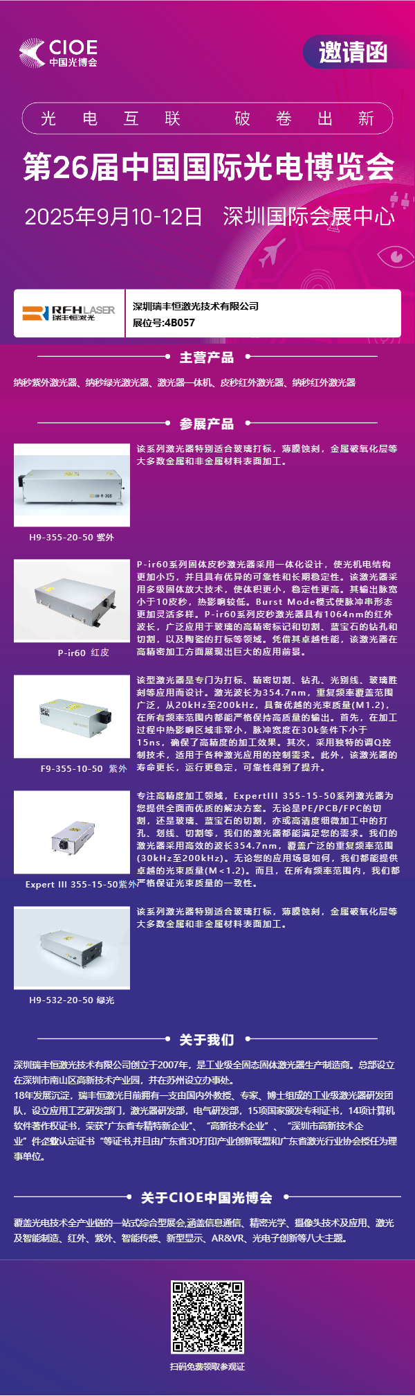 Vom 10. bis 12. September 2025 ist der Stand von RFH Laser im Shenzhen World Exhibition & Convention Center Ihre beste Wahl, um sich über die neuesten optoelektronischen Technologien zu informieren, Kooperationsprojekte zu besprechen und Ihr Geschäftsnetzwerk zu erweitern.